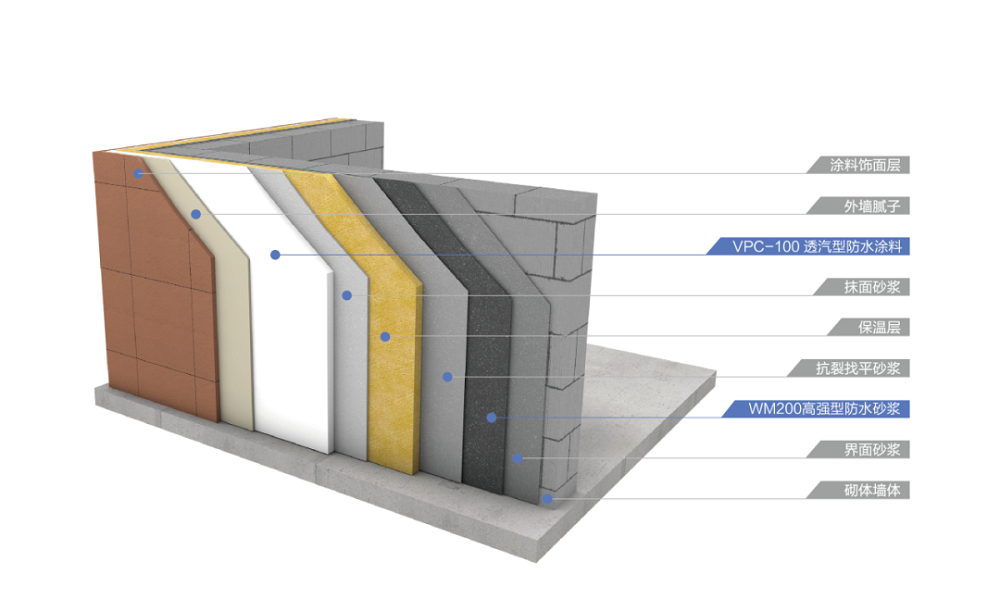 在此背景下,55世纪官网55sj01将《防水强条》规范、外墙防水工程痛点、市场需求,与自身丰富的实践与探索经验相结合,推出外墙防水专用新品——VPC-100透汽型柔性防水涂料。在实际应用中,该产品可与WM200高强型防水砂浆搭配使用构成两道防水层。二者组成的防水层与其他构造层次共同构成外墙外保温防水透汽系统。